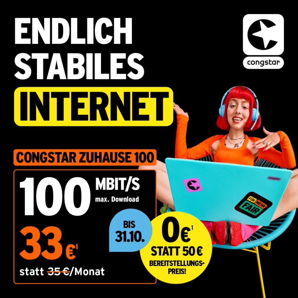 Neukundenaktion bis zum 31.10.2025. congstar Zuhause 100 kostet 33 statt 35 €/Monat. Mindestvertragslaufzeit: 24 Monate. Einmaliger Bereitstellungspreis: 0 € statt 50 €. Voraussetzung für die Nutzung des Tarifs ist ein geeignetes Endgerät (gegen Aufpreis erhältlich) congstar Zuhause 100 ermöglicht eine Datennutzung von max. 100 Mbit/s im Download und 40 Mbit/s im Upload. Ohne Festnetz-Telefonie. congstar Zuhause ist in vielen Anschlussbereichen verfügbar.